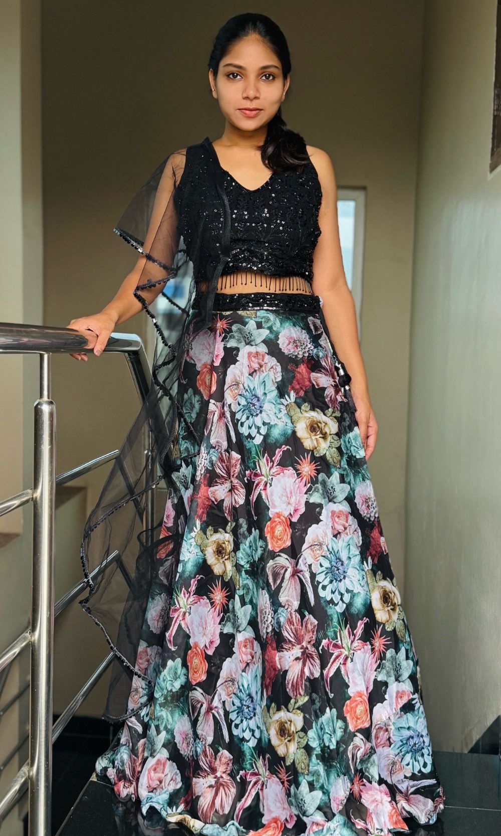This Black Floral Lehenga Set features a flowy silhouette adorned with bold multicolour floral prints. The black blouse is embellished with sequins and beadwork, paired with a lightweight black net dupatta. Perfect for parties, it offers a chic blend of glamour and grace.