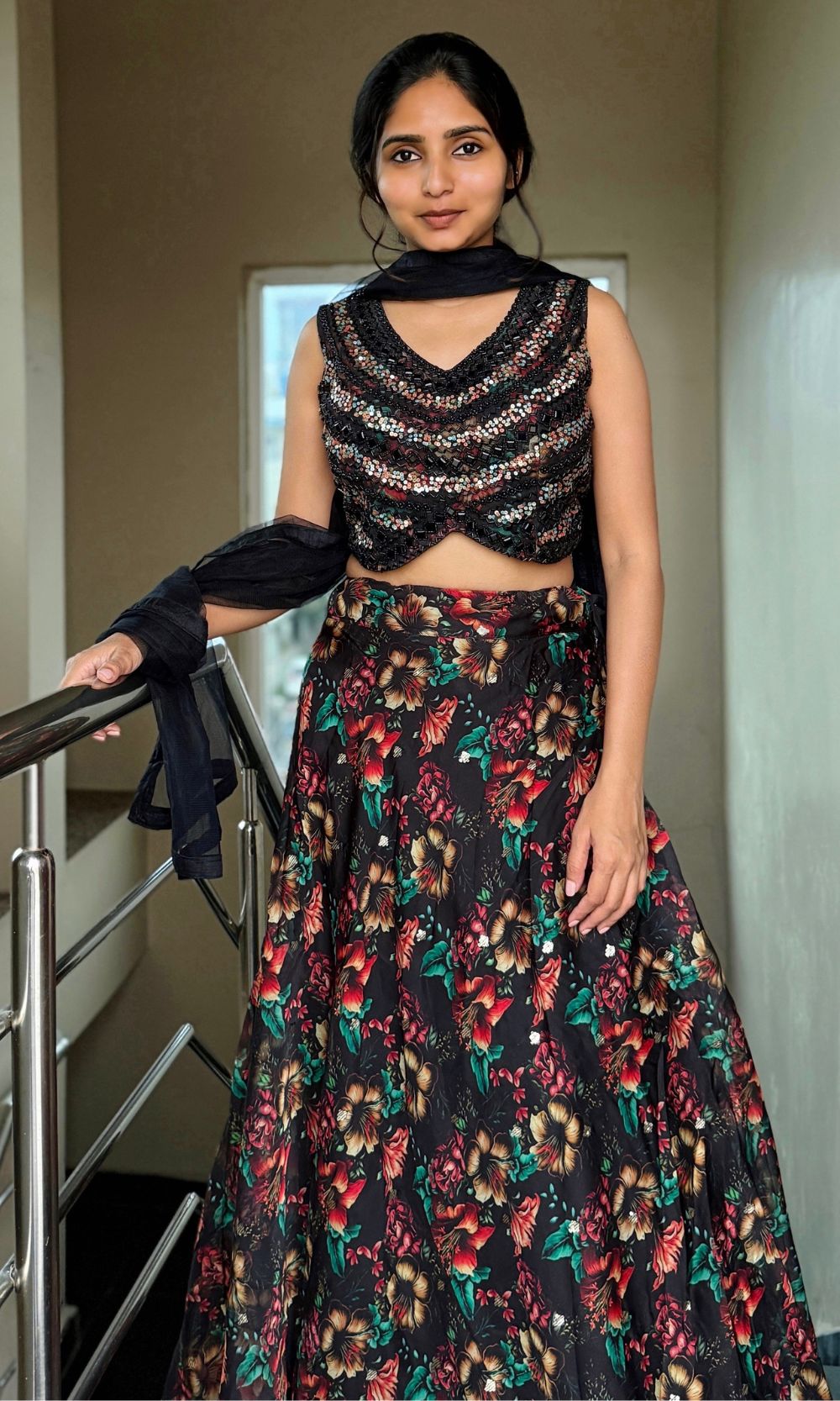 This Black Floral Lehenga Set combines traditional elegance with modern flair, featuring a flowy silhouette adorned with bold multi colour floral prints. The black blouse is richly embellished with sequins and beadwork, paired with a lightweight black net dupatta. Perfect for festive occasions.