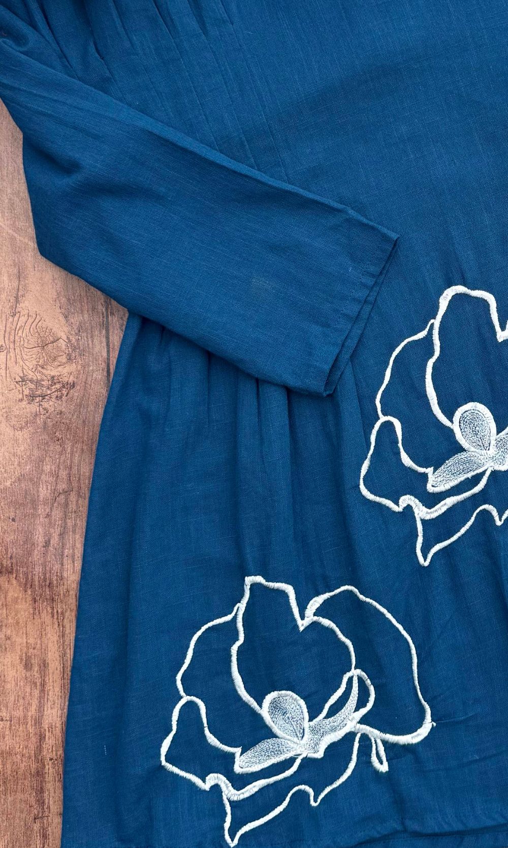 Description: This chic Blue co-ord set for women, designed with a graceful peplum-style kurta featuring simple delicate white floral embroidery. The flowy silhouette paired with comfortable straight-fit pants creates a flattering and modern ethnic look that works beautifully for both casual wear and semi-formal occasions. Crafted in a soft, breathable cotton blend, this outfit ensures all-day comfort without compromising on style.
