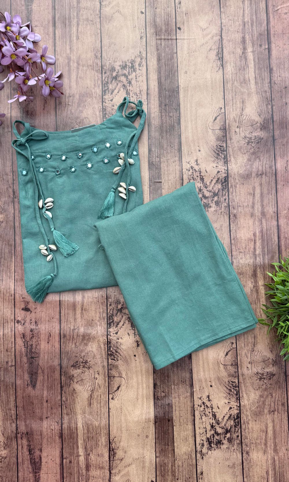 Description: This Coral spaghetti kurta palazzo set is designed for comfort and effortless style. Featuring unique shoulder tie-ups with tassels and subtle mirror detailing. This straight-cut kurti is paired with matching pants for a coordinated look that’s perfect for semi-party wear.