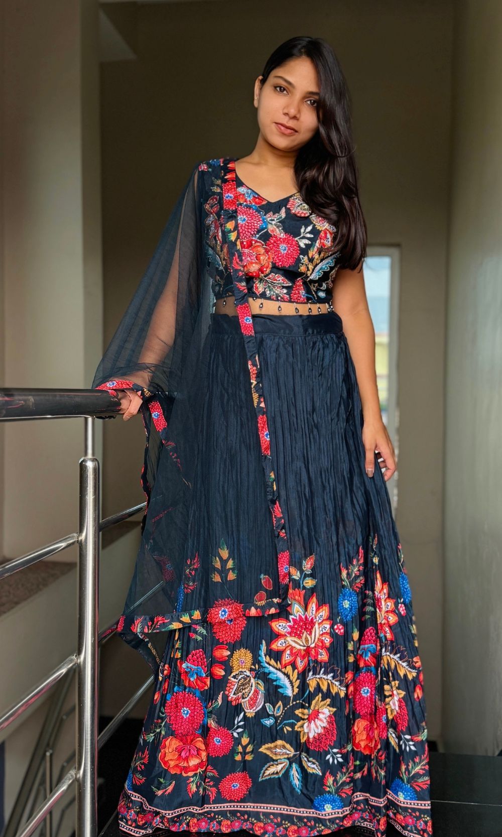 Dark- Blue Pleated Floral Lehenga Set