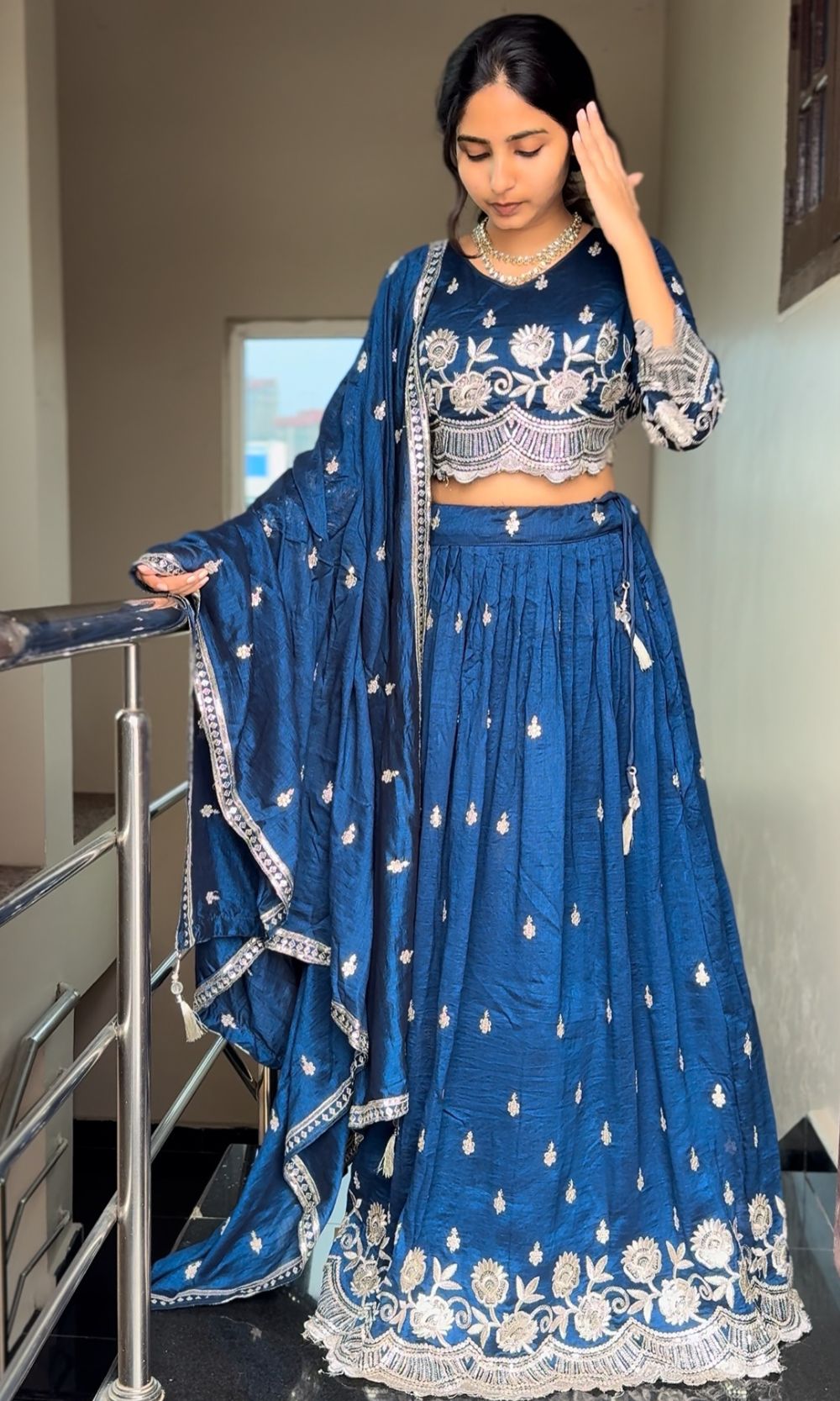 This Royal Blue pleated lehenga set with intricate silver embroidery, thread work, and sequin embellishments, perfect for weddings, receptions, and festive occasions. The designer blouse features elegant floral embroidery, scalloped edges, and flared sleeves, adding a touch of sophistication. The flared lehenga is adorned with intricate border detailing, and the matching dupatta has an embroidered border with tassel accents. This traditional yet modern ethnic wear is ideal for bridal, engagement, or sangeet ceremonies.