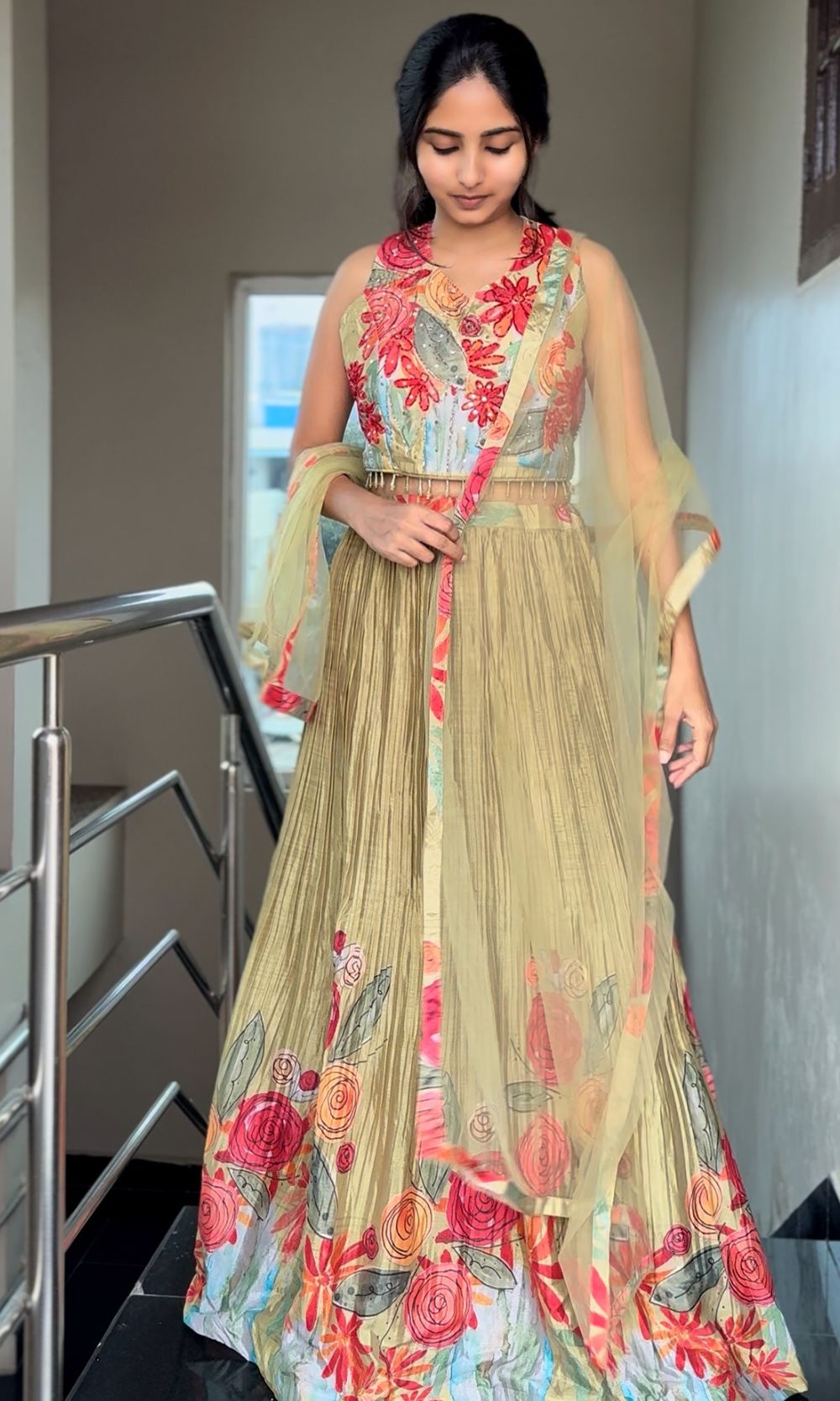 This Floral Print Modal-Satin pleated lehenga choli features vibrant digital prints of blooming flowers, blending tradition with modern aesthetics. The intricately embroidered blouse, adorned with red floral threadwork adds a touch of opulence. Paired with a sheer net dupatta, this lehenga is perfect for festive occasions, mehendi, weddings, and celebrations.