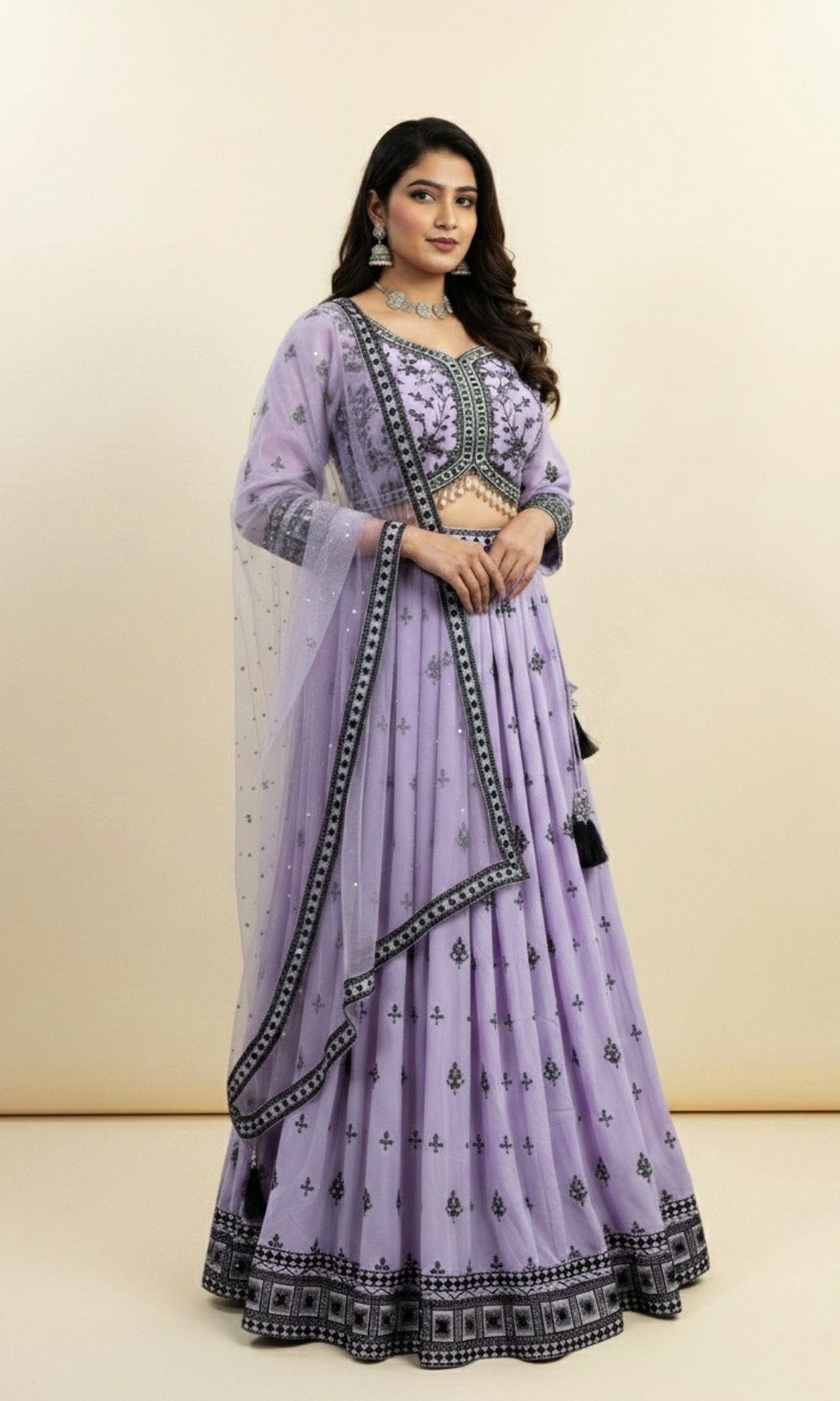This Lavender and Black embroidered lehenga set features intricate threadwork, mirror embellishments, and a detailed border. The soft net fabric, embroidered choli with pearl tassels, and flowy pleated lehenga create a stunning ethnic look. Paired with a sheer net dupatta, this outfit is perfect for festive occasions.