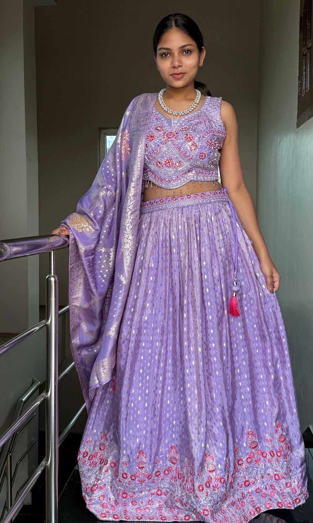 This Light Violet Embroidered Lehenga Set features a beautifully pleated lehenga with intricate red thread and zari embroidery, paired with a heavily embellished blouse. A luxurious Banarasi-style dupatta with golden woven motifs completes the look, adding elegance and richness. Ideal for weddings, festive celebrations, or special occasions.