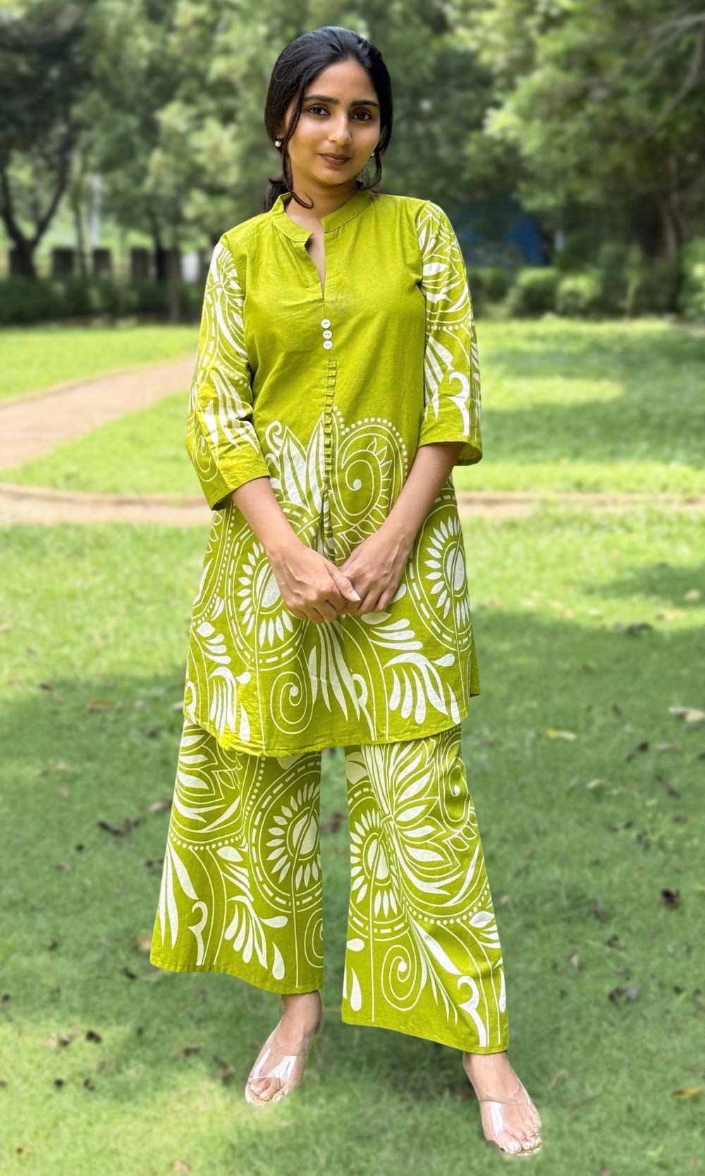 Description: This simple Lime green co-ord set features woven texture design, not printed. Comes with a high-neck kurta and matching pants. Made from soft, breathable fabric. Perfect for casual wear, work, or travel.