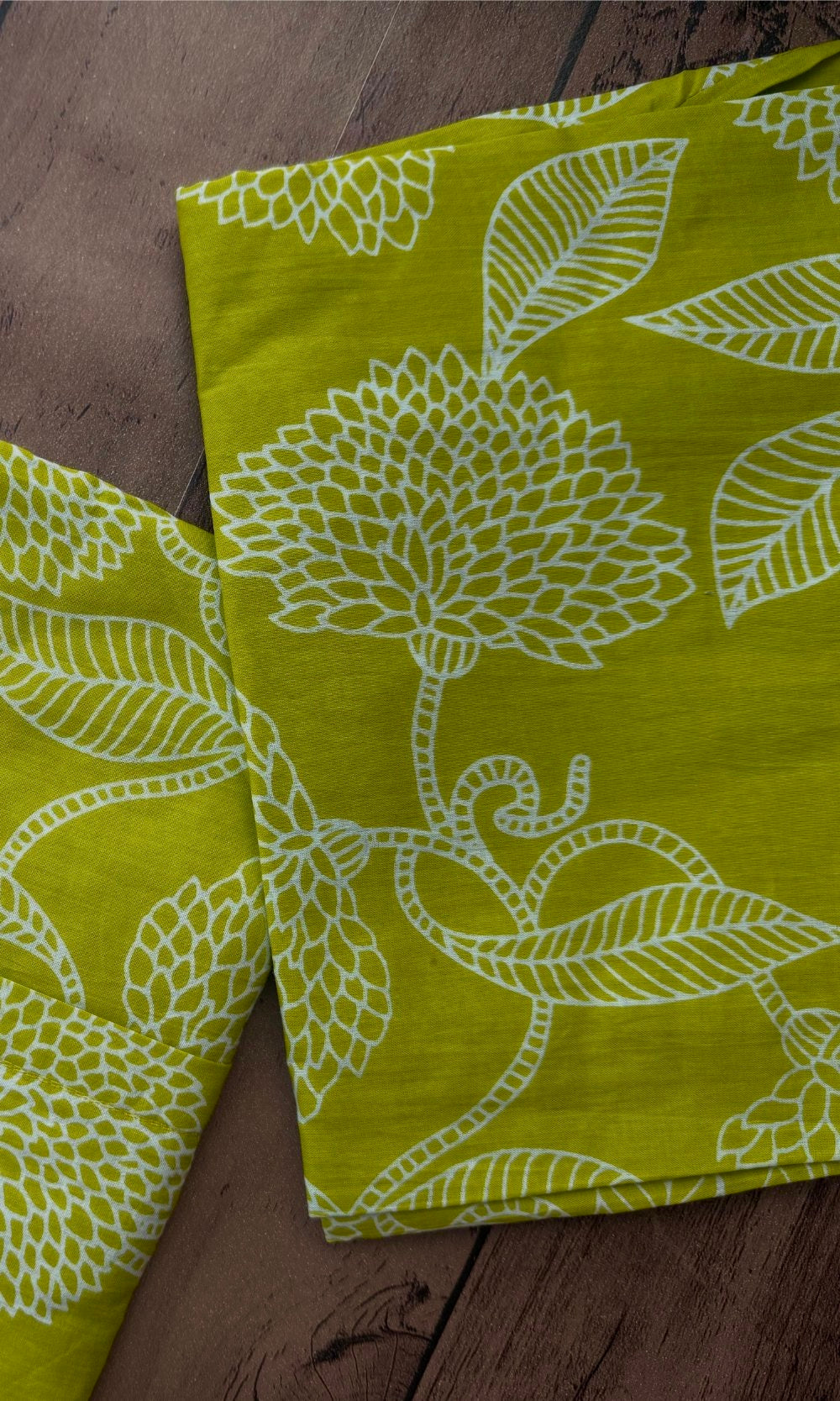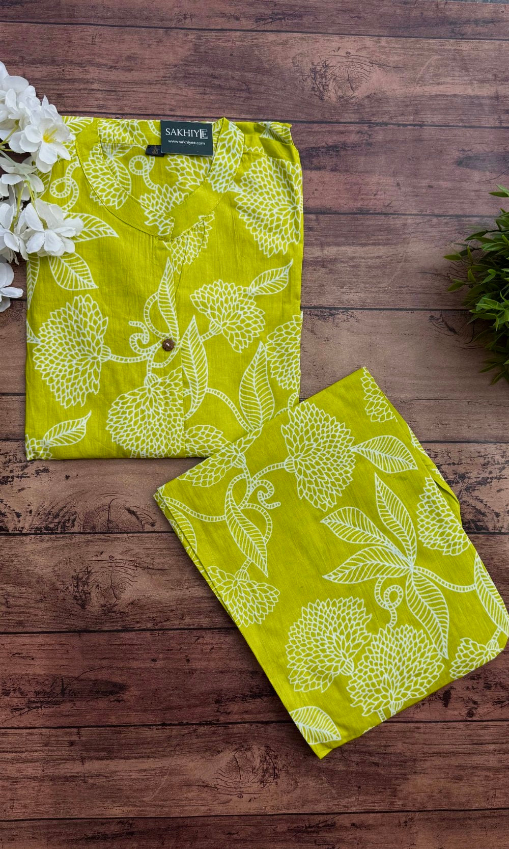 Description: Stay effortlessly stylish in this lime Yellow-White Floral Kurta Palazzo Co-ord Set featuring an all-over white florals. The button-down kurta is paired with matching pants, making it a comfortable yet perfect choice for everyday or semi-casual wear.