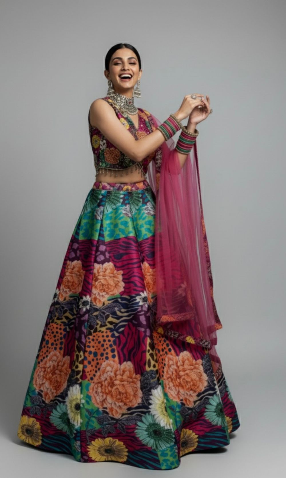 This Multi-Colour Floral Print lehenga choli Features a flared skirt adorned with bold floral motifs and animal print accents, this lehenga is a perfect blend of traditional elegance and contemporary fashion. The sleeveless V-neck blouse is beautifully embellished with intricate bead detailing, enhancing its festive appeal. A sheer pink net dupatta adds a touch of grace to the ensemble. Perfect for Festive occasions, weddings, sangeet, mehendi and special celebrations.