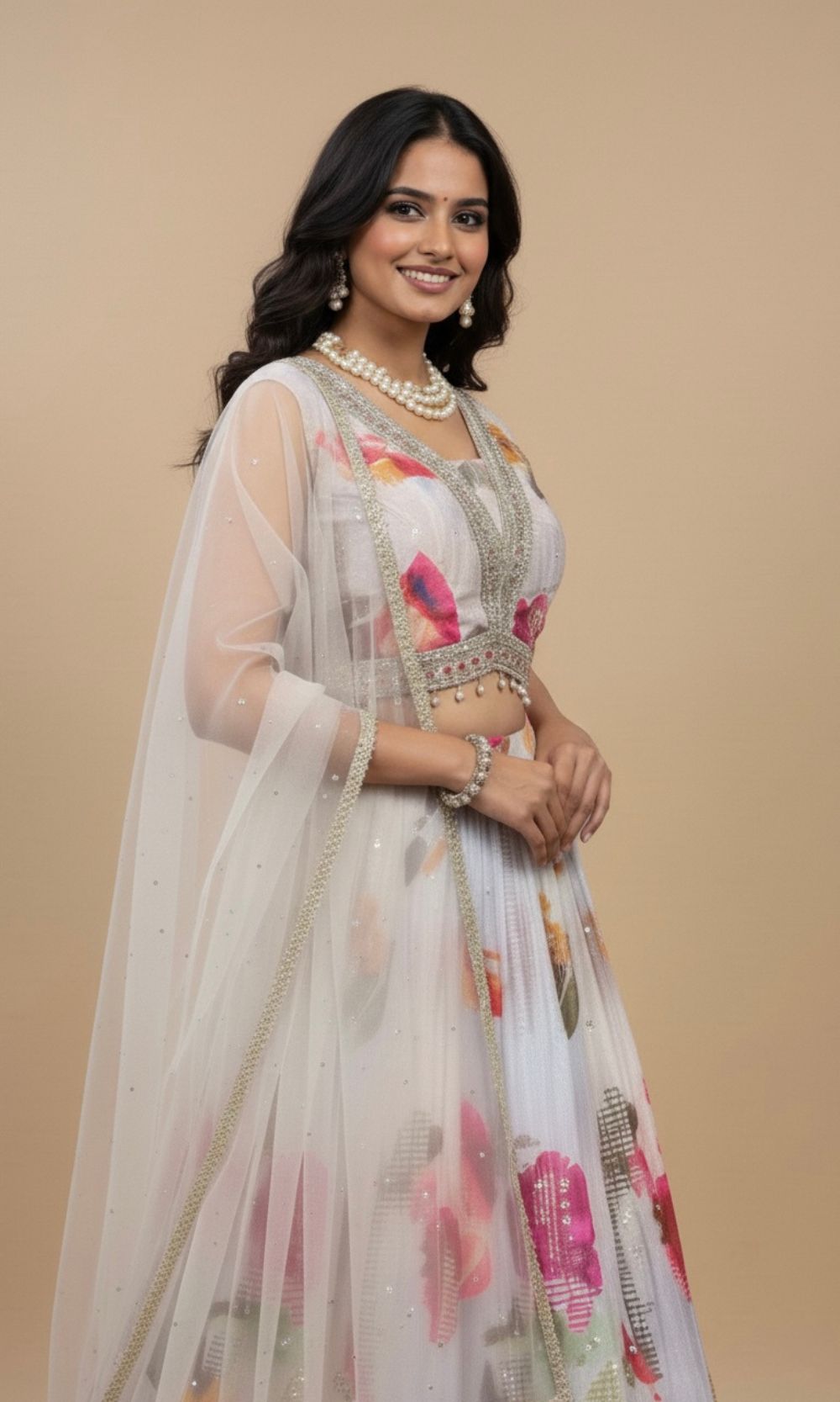 This exquisite floral pleated lehenga set, feature a soft silk fabric with a muted off-white vibrant multi-colour floral print. The deep V-neck embroidered blouse is adorned with delicate sequin and beadwork, adding a touch of glamour. The lightweight sheer net dupatta with a shimmering gold border complements the look, making it ideal for daytime weddings, festive occasions, and summer celebrations.