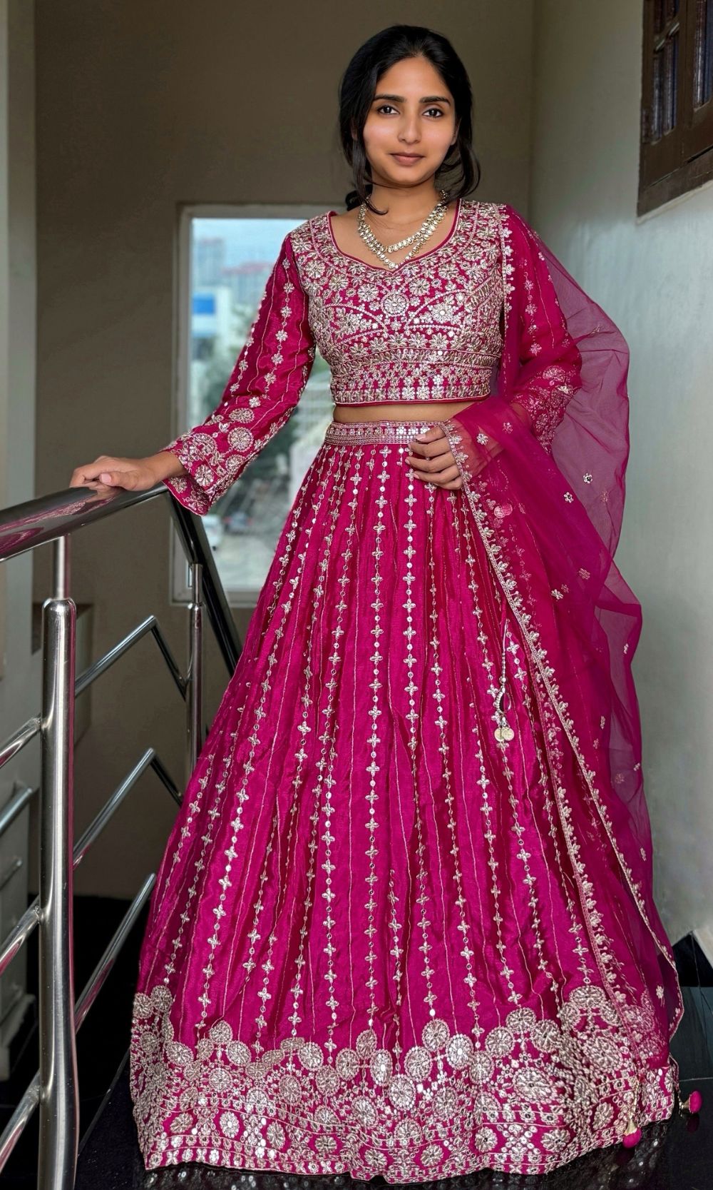 This Pink Georgette lehenga features intricate zari embroidery work, sequins on a flared silhouette, making it perfect for weddings and festive wear The designer lehenga choli comes with a heavily embroidered blouse with three-quarter sleeves and a lightweight net dupatta, blending elegance with timeless ethnic fashion.