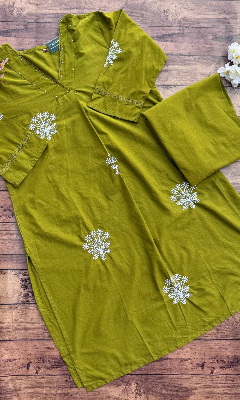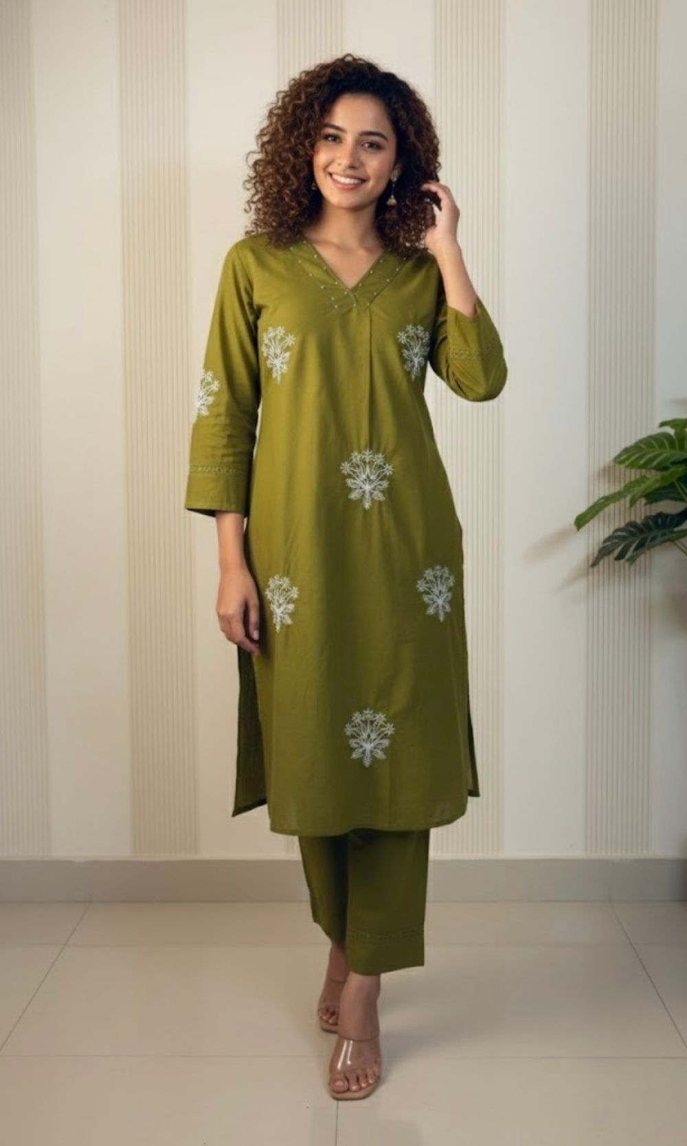 Description: This Olive Green Cotton Embroidered Kurta Pant Set is a versatile ethnic essential, perfect for daily elegance and festive simplicity. The kurta features subtle white thread embroidery in spaced floral butti patterns, a V-shaped neckline, and full-length sleeves. Made in breathable 100% cotton, the kurta is paired with matching straight-cut pants for all-day comfort. Whether you're heading to work, running errands, or celebrating at home, this set brings together comfort and minimal sophistication.