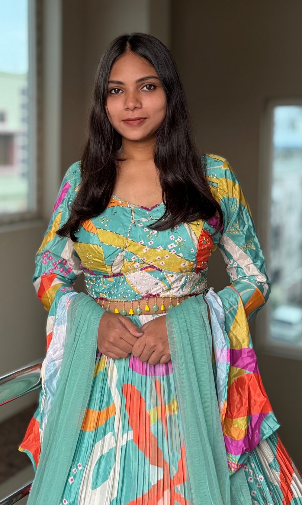 This Turquoise-Blue Pleated lehenga set is a celebration of colors, combining traditional patchwork with a modern twist. The intricately designed long-sleeve blouse features stunning stone work and delicate thread embroidery, making it a statement piece. The pleated skirt boasts a mix of abstract floral and geometric patterns, exuding playful elegance. The soft net dupatta adds a graceful finishing touch, making this outfit a perfect choice for festive occasions, Mehendi, or Haldi celebrations.