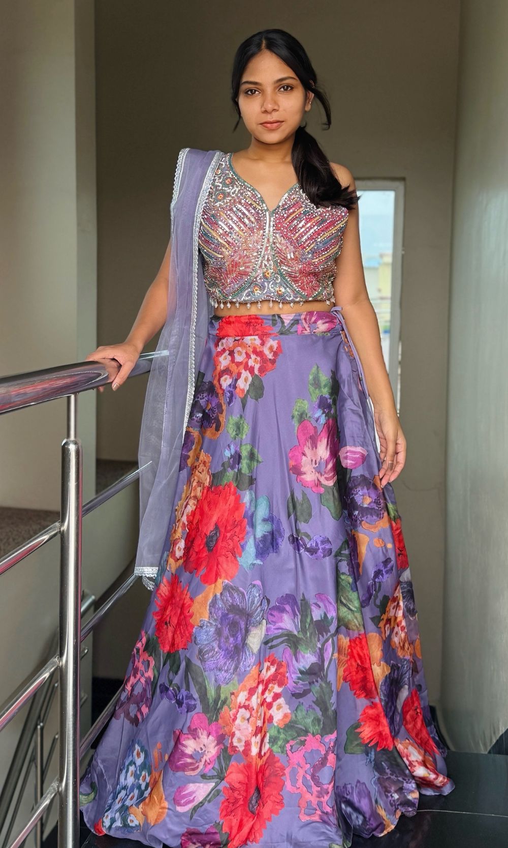 This Violet Floral Print Lehenga features a stunning flared silhouette with vibrant floral patterns, intricate sequins, and bead embellishments, making it a perfect choice for festive occasions and parties. The designer lehenga choli includes a heavily embroidered sleeveless blouse with intricate mirror and beadwork, complemented by a lightweight sheer net dupatta for an elegant finish.