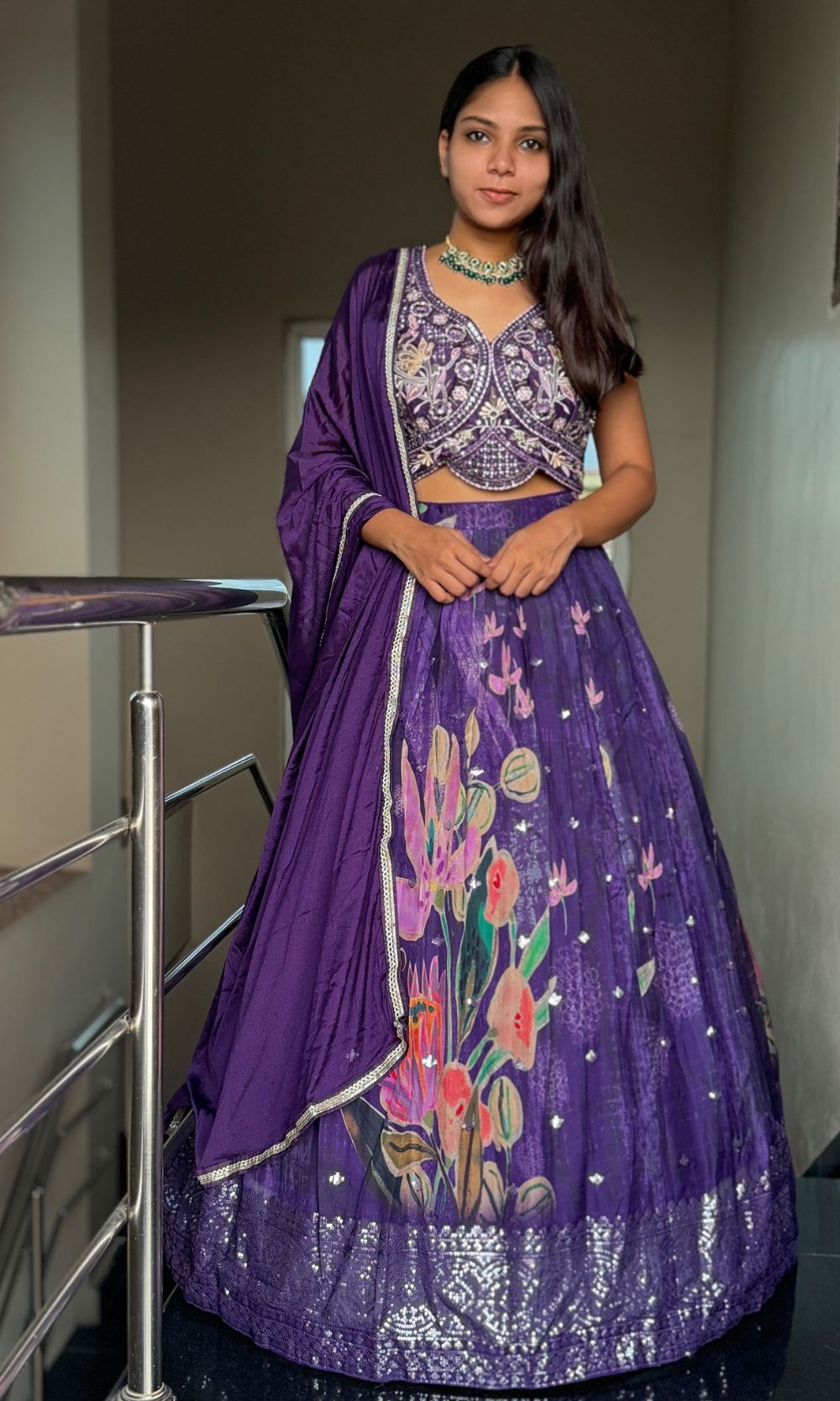 This Violet Lehenga features a flared silhouette adorned with floral prints, intricate embroidery, sequins, and beadwork, making it an ideal choice for weddings, festive wear, and receptions. The designer lehenga choli includes a deep V-neck embroidered blouse with mirror and bead detailing, while the lightweight dupatta adds an elegant touch, blending ethnic fashion with modern sophistication.