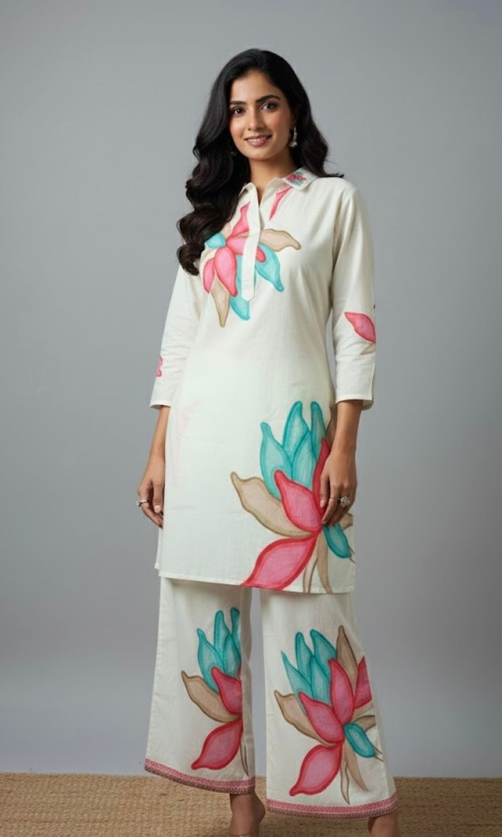 Description: This elegant White co-ord set features large, eye-catching lotus flower prints in shades of pink and turquoise, adding a vibrant and refreshing touch. The kurta is designed with a mandarin collar, and 3/4th sleeves, paired with matching straight-fit pants for a coordinated, comfortable look. This outfit is ideal for casual outings and summer gatherings.