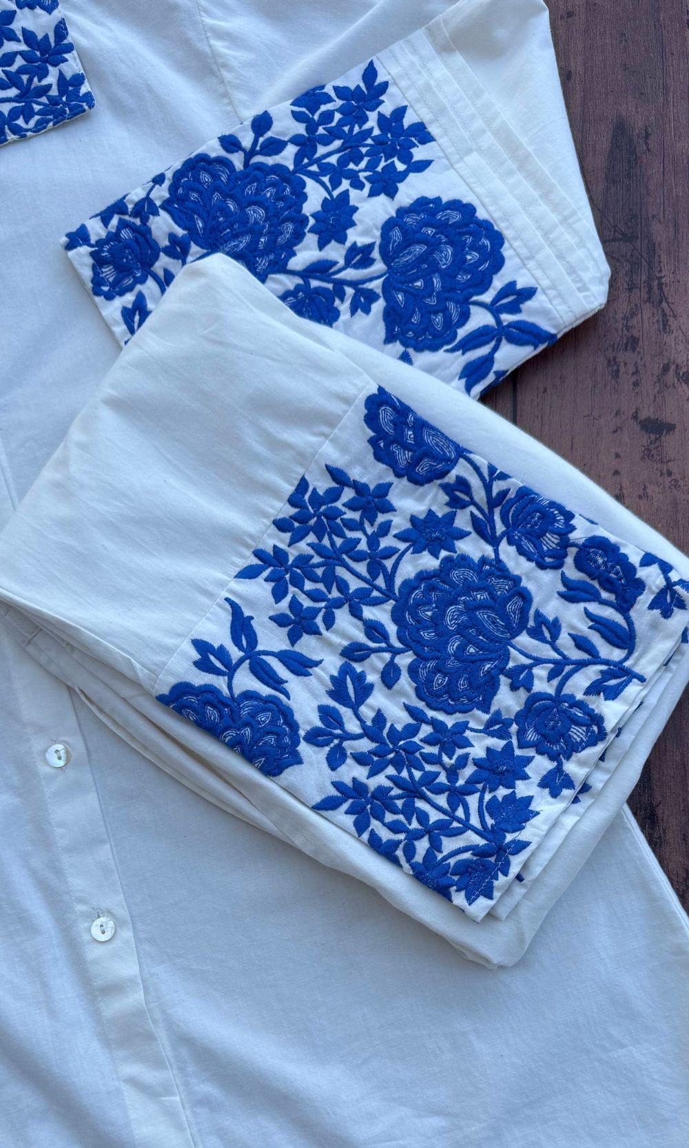 Description: This graceful White and Blue co-ord set for women features beautiful blue floral embroidery on the collar, sleeves, and pant hems, adding a refreshing and stylish touch. The button-down top is designed with a collared neckline and relaxed fit, paired with matching straight-fit pants for a coordinated, comfortable look. Made from soft, breathable cotton fabric, this set is perfect for casual outings and summer wear.