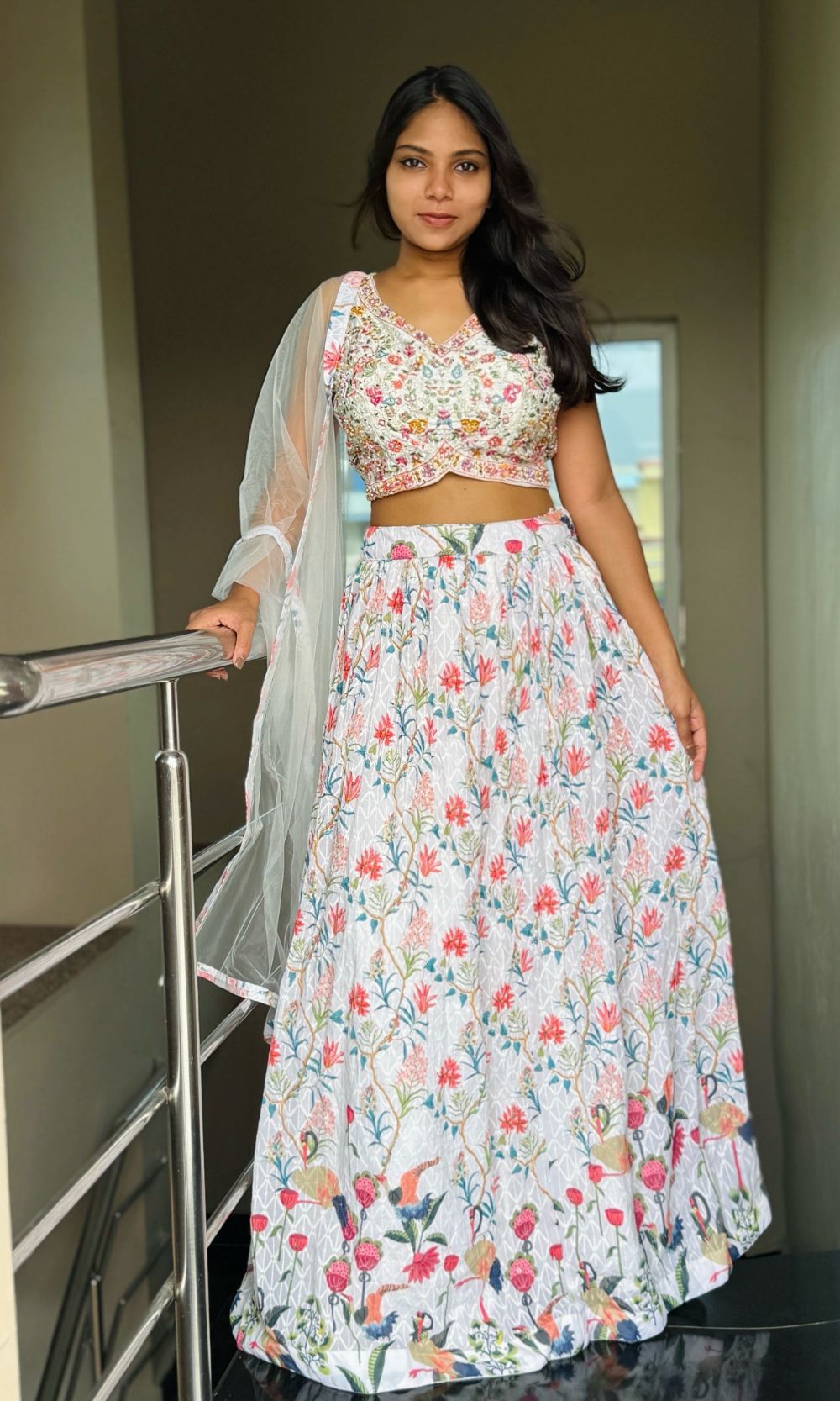 This white lehenga features floral embroidery, sequins, beads, and stonework on a pleated silhouette, paired with a embroidered blouse and a lightweight net dupatta. Perfect for weddings, festive wear, and haldi, this designer lehenga choli blends ethnic fashion with elegance.