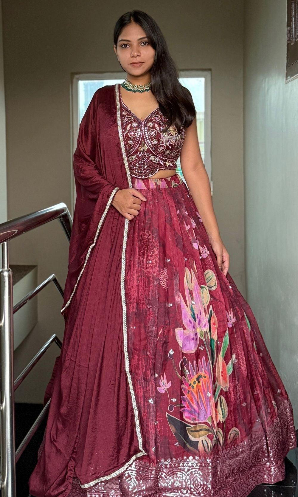 This Wine Brown Lehenga features a flared silhouette adorned with floral prints, intricate embroidery, sequins, and beadwork, making it an ideal choice for weddings, festive wear, and receptions. The designer lehenga choli includes a deep V-neck embroidered blouse with mirror and bead detailing, while the lightweight dupatta adds an elegant touch, blending ethnic fashion with modern sophistication.